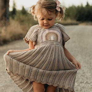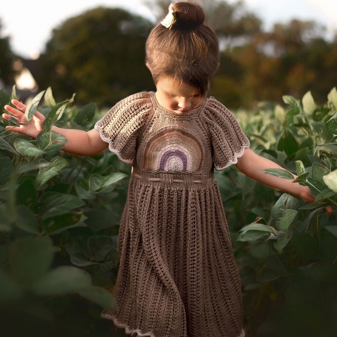 That’s the feeling behind the Rainbow Dress. Made slowly, by hand, with patience and care, it holds the quiet magic of simple moments... sunlight through lace, a twirl before dinner, a rainbow that makes everyone smile.