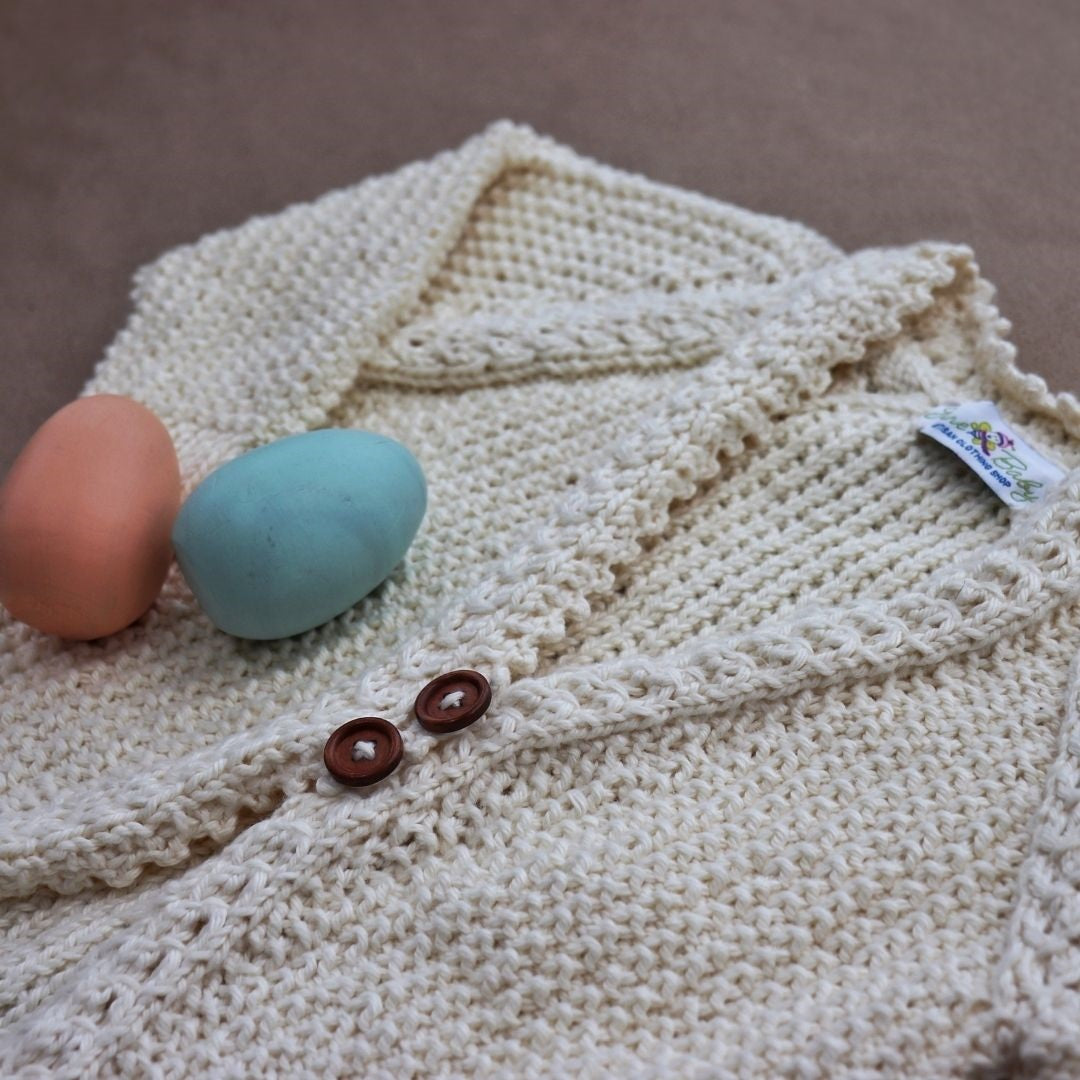 Vintage charm: Cable-knit rib finished with a delicate crocheted trim for heirloom beauty.