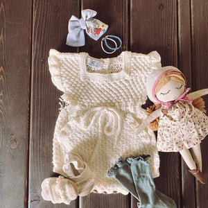 Doll sets include the romper, a beanie, and booties in matching colors.