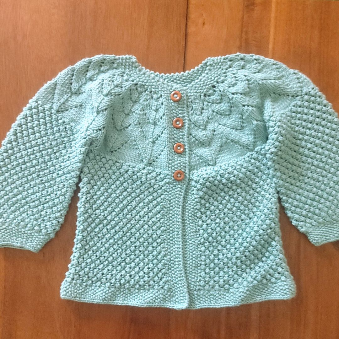 A Classic Design: Features a collarless knit with a delicate leaf lace pattern on the yoke for a sweet, feminine touch. The signature bubble stitch on the body and sleeves provides a luxurious texture that never goes out of style.