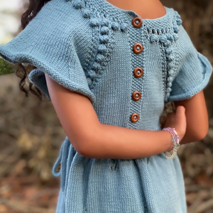 This elegant dress is our newest JuneBeeBaby piece! My favorite features are the flared ruffled sleeves and the popcorn knits along the neckline that resemble a pearl necklace. No need to size up🤍