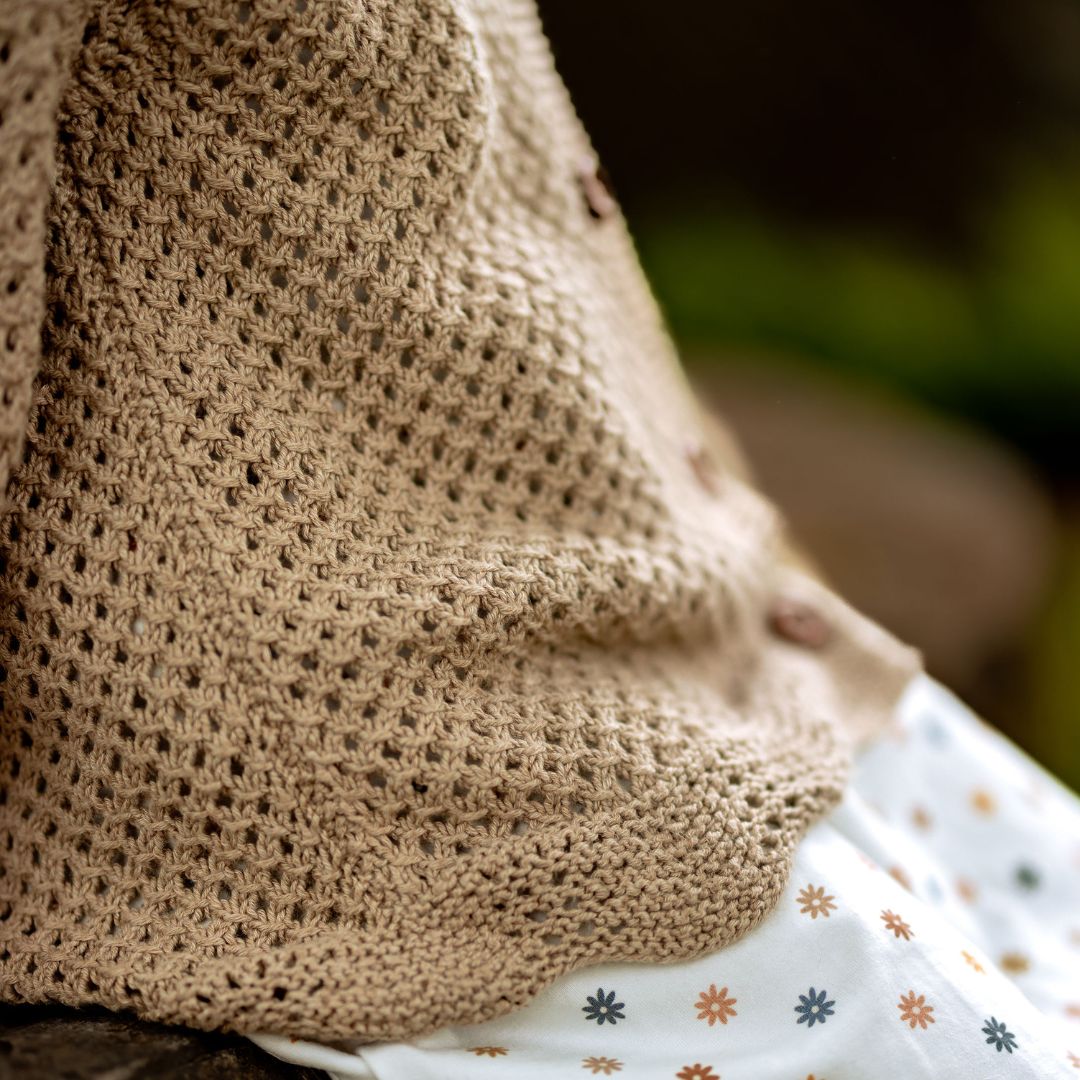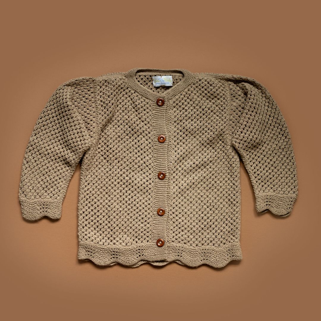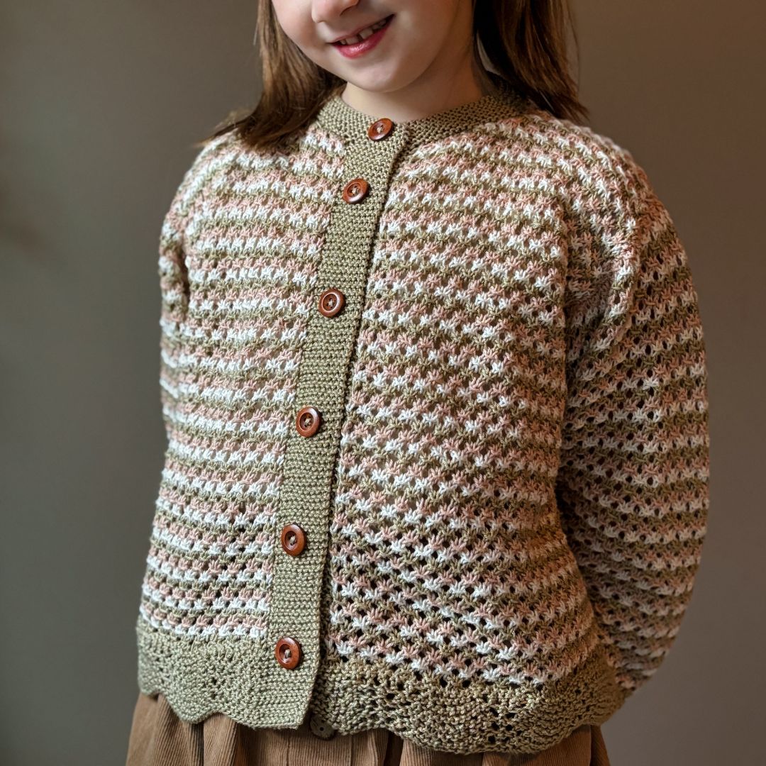 The Taylor Cardi captures that feeling perfectly. Hand knitted with care, it’s a blend of vintage charm and everyday practicality. Soft, scalloped edges, delicate lacework, and wooden buttons that feel as natural as the cotton it’s made from.